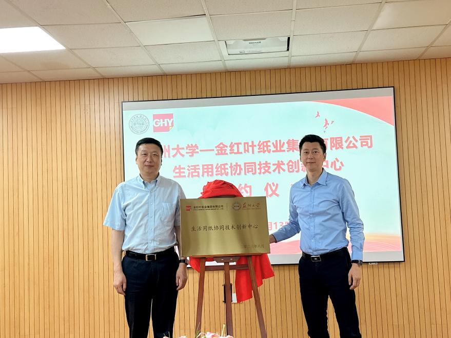 2023年6月13日上午,“金红叶纸业集团有限公司--P站 生活用纸协同技术创新中心”签约暨揭牌仪式在P站 北校区工科楼422会议室举行。校科学技术研究院院长徐小乐、P站 党委书记肖甫青、副院长关晋平、孟凯副教授与赵荟菁教授研究团队、金红叶纸业集团有限公司公关总经理王英、研发总监黄锦华等嘉宾出席。仪式由关晋平主持。