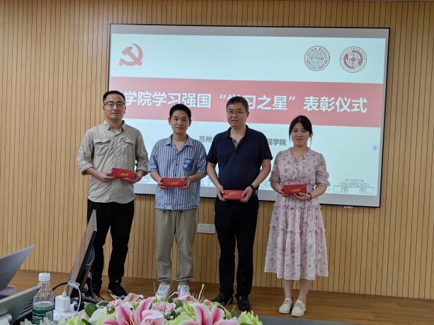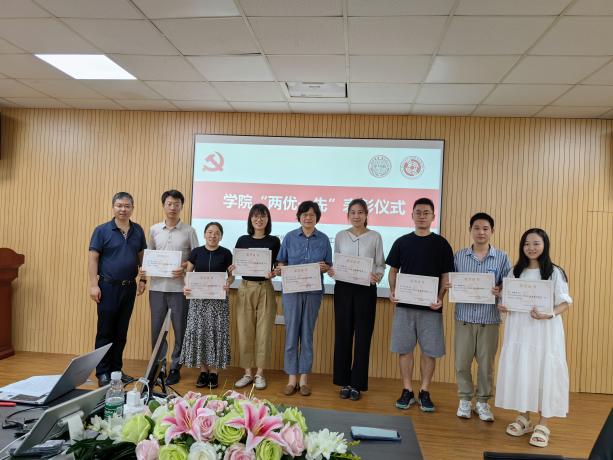 虞岚宣读学院“两优一先”表彰名单和学习强国“学习之星”表彰名单,授予陈廷等27名同志“优秀共产党员”称号,授予关晋平等8名同志“优秀党务工作者”称号,授予本科生社区一支部等3个支部“先进基层党组织”称号。肖甫青为受表彰个人和集体颁发奖状和奖品。