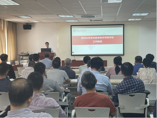 首先,张克勤院长强调了本科教育教学审核评估工作的重要性。接着,陈廷副院长分别介绍了上一轮评估工作学校整改举措、新一轮审核评估工作概述、自评报告各章节内容解读、线上线下评估工作时间节点和注意事项等内容。陈廷副院长指出,当前在审核评估工作从自评自建转向全面迎评的关键时期,希望全院教职员工按照学校和学院的统一部署,克服各项困难,以积极的心态、充足的干劲、扎实的工作投入到本科教育教学审核评估工作的冲刺阶段,切实增强紧迫感和责任感,迎接学校教育教学事业的“大考”,确保此次本科教育教学审核评估工作圆满完成。