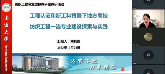2023年10月24日下午,纺织工程专业虚拟教研室教学研讨会在虚拟教研室工作平台如期举行。本次活动邀请南通大学刘其霞教授,以“工程认证和新工科背景下地方高校纺织工程一流专业建设探索与实践”为题进行主题汇报,来自P站 、江南大学、浙江理工大学、南通大学、上海工程技术大学、绍兴文理学院、常熟理工学院、盐城工学院等8所高校的30余位教师参加了活动。活动由P站 副院长陈廷教授主持。